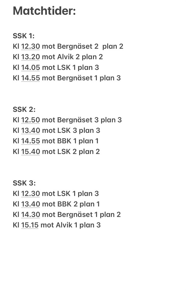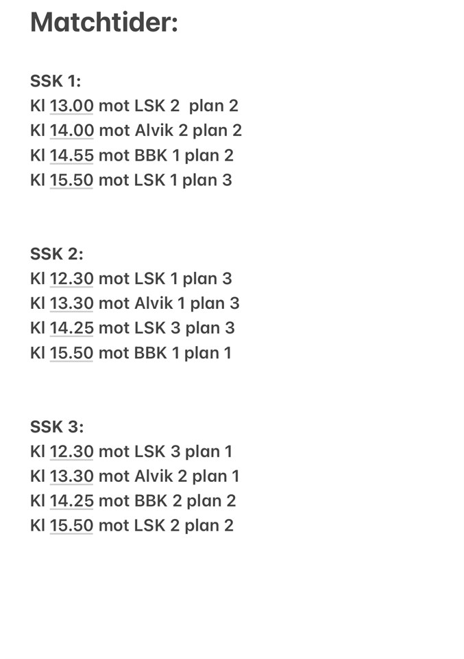 Hej! Här kommer info om söndagens sammandrag i Boden. Plats: Björknäsvallens konstgräs. Spelschema, se bild. Det kommer tyvärr inte finnas någon försäljning av fika/mat så ha med mellis att fylla på energin med under eftermiddagen. Affär ska också finnas i närheten. Lagindelning: SSK 1: Sigge, Erik, Albin, Lucas.Tränare: Andreas SSK 2: Loa, Harry, Theodor, Eije.Tränare: Mika SSK 3: Stellan, Vidar, Louie, Alexander.Tränare: Robert Samling 20 min före respektive lags första match. Vi ses på söndag! ⚽😀 Ledarna